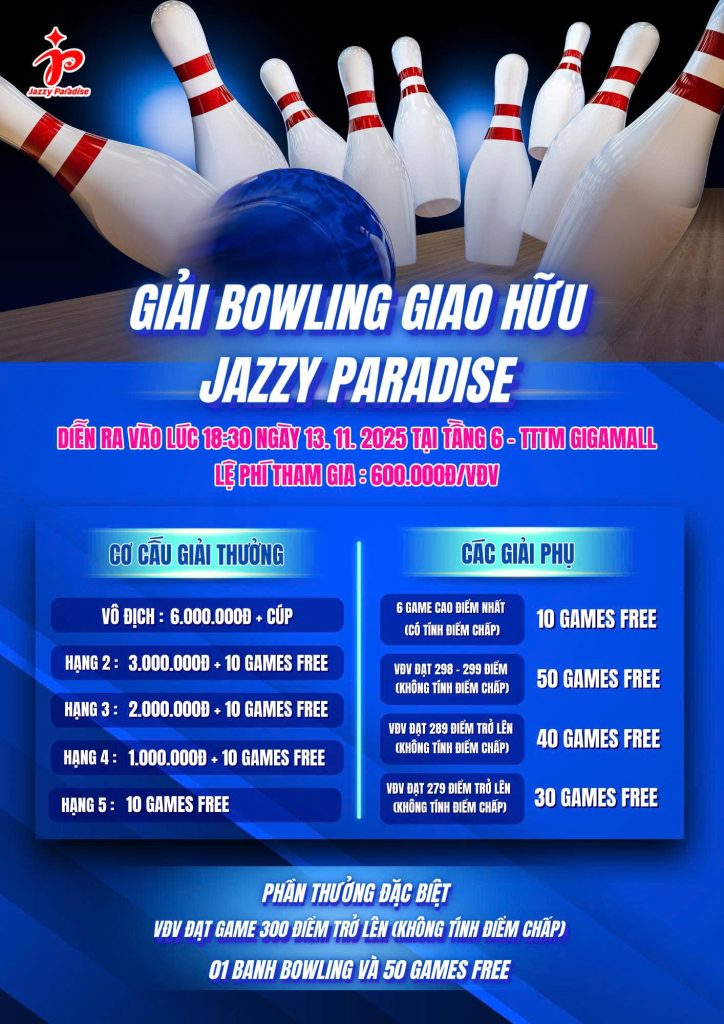 Vào 18h30 ngày 13.11.2025, Giải Bowling Giao Hữu Jazzy Paradise chính thức diễn ra tại JP Bowling – Tầng 6, TTTM Gigamall!